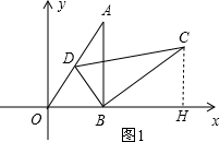当△ABO绕点B顺时针旋转60°得到△CBD,如图1,作CH⊥x轴,则BC=AB=2$\sqrt{3}$,∠ABC=60°,![]()