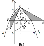 (3)根据待定系数法可得直线BF解析式为y=-$\frac{1}{2}$x+2,将点F(x,-$\frac{1}{2}$x+2)代入抛物线的解析式可得-$\frac{1}{2}$x+2=-$\frac{1}{2}$x2+x+4,可得点F(-1,$\frac{5}{2}$),由对称性FH=KH=2,得点K(3,$\frac{5}{2}$),得到点D(1,$\frac{9}{2}$),DH=$\frac{9}{2}$-$\frac{5}{2}$=2,设点P坐标为(m,-$\frac{1}{2}$m2+m+4),过点P作PS⊥DH于点S,PN⊥FK于点N,如图2,由三角函数得到MH=m-1=PS=HN,连结DF,DK延长DP交FK延长线于点R,可证△DFG≌△DKR,得到FG=KR=2(m-1),在Rt△PNR中tan∠R=$\frac{PN}{NR}$=$\frac{-\frac{1}{2}(m-3)(m+1)}{m+1}$=$\frac{1}{2}$(3-m),在Rt△DHR中tan∠R=$\frac{DH}{HR}$=$\frac{2}{2m}$=$\frac{1}{m}$,可得$\frac{1}{2}$(3-m)=$\frac{1}{m}$,得到点P坐标(2,4),进一步得到S=$\frac{8}{3}$.