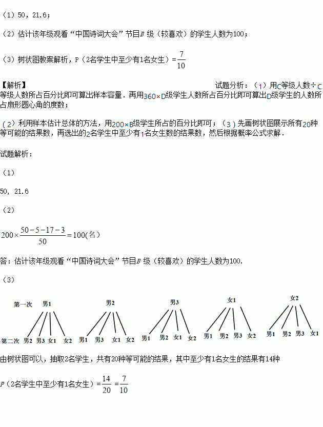 (3)若从本次调查中的 A 级(非常喜欢)的5名学生中,选出2名去参加广州市中学生诗词大会比赛,已知A级学生中男生有 3名,请用“列表”或“画树状图”的方法求出所选出的2名学生中至少有1名女生的概率.