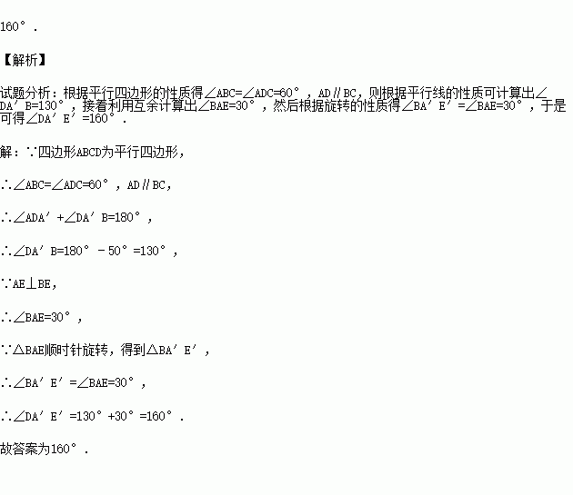 (2015秋•河西区期中)如图,已知平行四边形ABCD中,AE⊥BC于点E,以点B为中心,取旋转角等于∠ABC,把△BAE顺时针旋转,得到△BA′E′,连接DA′.若∠ADC=60°,∠ADA′=50°,则∠DA′E′的度数为 .