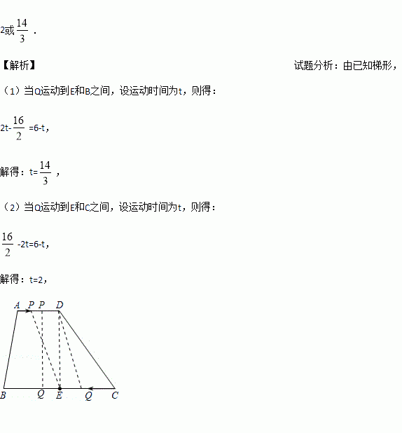 如图,在四边形ABCD中,AD∥BC,AD=6,BC=16,E是BC的中点.点P以每秒1个单位长度的速度从点A出发,沿AD向点D运动;点Q同时以每秒2个单位长度的速度从点C出发,沿CB向点B运动.点P停止运动时,点Q也随之停止运动.当运动时间(______)秒时,以点P,Q,E,D为顶点的四边形是平行四边形.