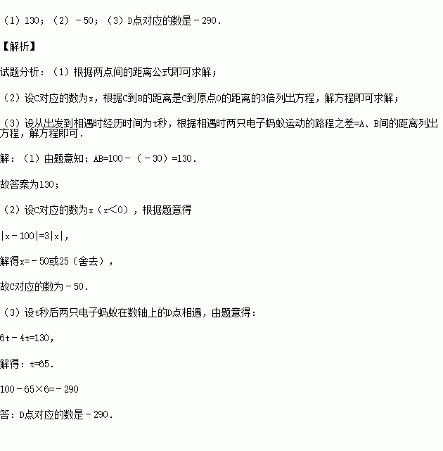 (3)若当电子P从B点出发,以6个单位长度/秒的速度向左运动,同时另一只电子蚂蚁Q恰好从A点出发,以4个单位长度/秒的速度向左运动,设两只电子蚂蚁在数轴上的D点相遇,那么D点对应的数是多少?
