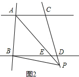 分析 (1)过P作PE∥AC,根据平行线的性质可得∠CAP=∠1,∠PBD=∠2,进而可得∠APB=∠CAP+∠PBD;