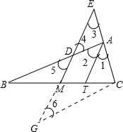 解答 证明:如图,过点C作AB的平行线交EM的延长线于G,则∠6=∠5,∠B=∠CMG,∠4=∠6.![]()