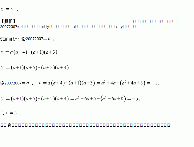 y=20072008×20072012-20072009×20072011,若设20072007=a,试用类似方法比较x、y的大小.