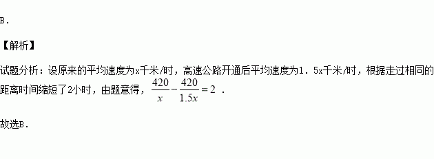 甲乙两地相距420千米,新修的高速公路开通后,在甲、乙两地行驶的长途客运车平均速度是原来的1.5倍,进而从甲地到乙地的时间缩短了2小时.设原来的平均速度为x千米/时,可列方程为( )