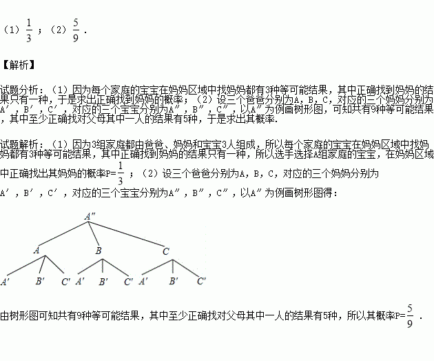 (2)如果任选一个宝宝(假如选A组家庭),通过列表或树状图的方法,求选手至少正确找对宝宝父母其中一人的概率.