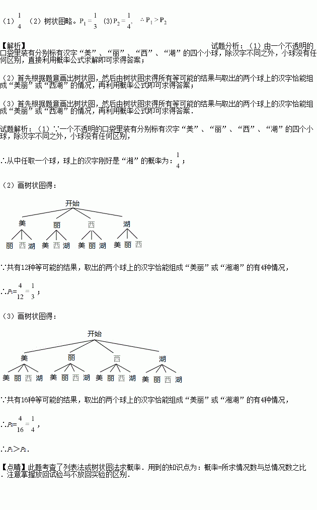 (3)乙从中任取一球,记下汉字后再放回袋中,再从中任取一球,记乙取出的两个球上的汉字恰能组成“美丽”或“西湖”的概率为P2,请比较P1,P2的大小关系。