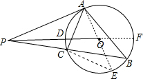 分析 (1)作直径AE,连结CE,如图,根据切线的性质得∠EAC+∠CAP=90°,再根据圆周角定理得∠ACE=90°,所以∠E+∠EAC=90°,则∠E=∠CAP,加上∠E=∠B,则∠CAP=∠B,于是可判断△PAC∽△PBA,利用相似比和比例的性质可得PA2=PB•PC;