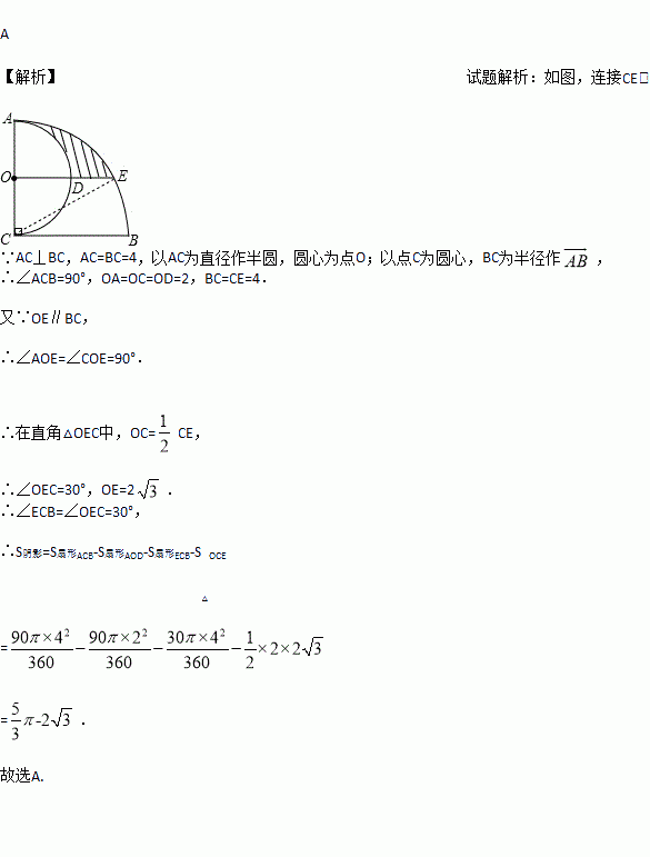 如图,AC⊥BC,AC=BC=4,以AC为直径作半圆,圆心为点O;以点C为圆心,BC为半径作弧AB.过点O作BC的平行线交两弧于点D、E,则阴影部分的面积是( )