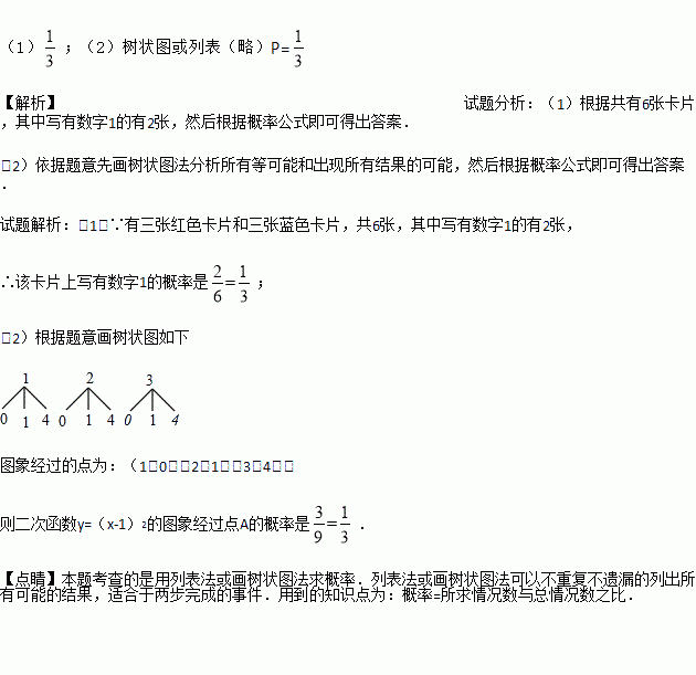 (2)将3张蓝色卡片取出后放入另外一个不透明的盒子内,然后在两个盒子内各任意抽取一张卡片,以红色卡片上的数字作为x,蓝色卡片上的数字作为y,将(x,y)作为点A的坐标,请用列举法(画树状图或列表)求二次函数y=(x-1)2的图像经过点A的概率.