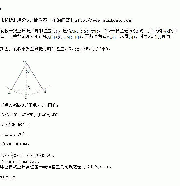 如图所示,秋千链子的长度为4 m,当秋千向两边摆动时,两边的最大摆动角度均为30°.则它摆动至最高位置与最低位置的高度之差为( )