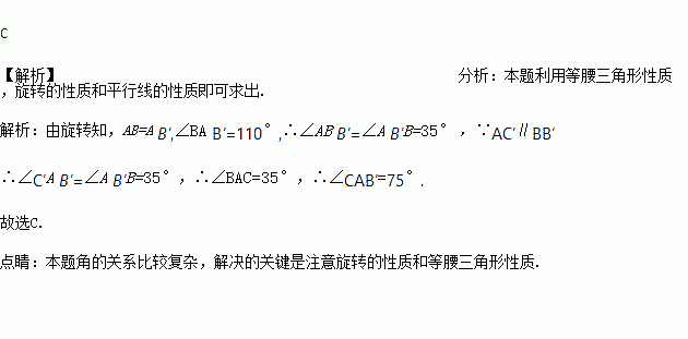 如图,已知钝角三角形ABC,将△ABC绕点A按逆时针方向旋转110°得到△AB′C′,连接BB′,若AC′∥BB′,则∠CAB′的度数为( )