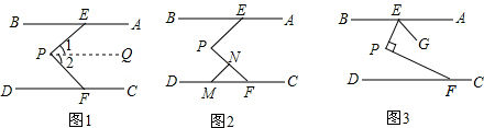 分析:(1)过P作PQ平行于AB,由AB与CD平行,得到PQ与CD平行,利用两直线平行内错角相等得到两对角相等,再由∠EPF=∠1+∠2,等量代换就可得证;