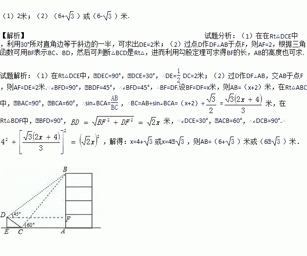 如图,在大楼AB的正前方有一斜坡CD,CD=4米,坡角∠DCE=30°,小红在斜坡下的点C处测得楼顶B的仰角为60°,在斜坡上的点D处测得楼顶B的仰角为45°,其中点A、C、E在同一直线上.