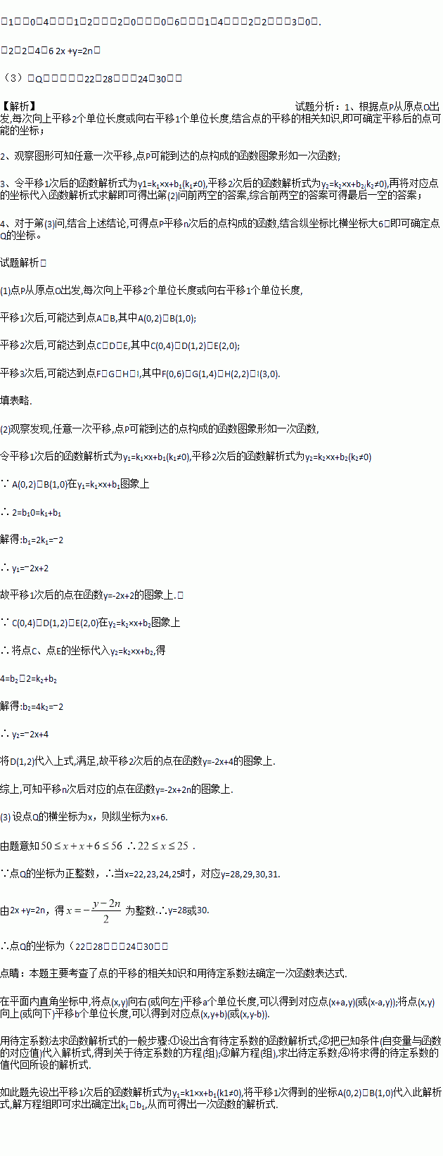 例如:平移1次后2x+y= _________;平移2次后2x+y= ;平移3次后2x+y= ;……由此我们知道,平移n次后点P的坐标都满足一定的关系式是 ;