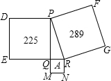 分析 根据正方形的面积等于边长的平方,由正方形PQED的面积和正方形PRQF的面积分别表示出PR的平方及PQ的平方,又三角形PQR为直角三角形,根据勾股定理求出QR的平方,即为所求正方形的面积.