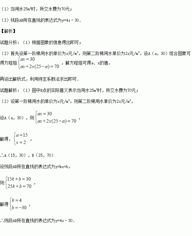 为加强公路的节水意识,合理利用水资源,某市对居民用水实行阶梯水价,居民家庭每月用水量划分为两个阶梯,一、二阶梯用水的单价之比等于1:2,如图折线表示实行阶梯水价后每月水费y(元)与用水量x(m3)之间的函数关系,其中射线AB表示第二级阶梯时y与x之间的函数关系.