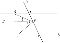 分析:(1)首先过点P作PE∥l1,由l1∥l2,可得PE∥l2∥l1,根据两直线平行,内错角相等,即可求得:∠APB=∠PAC+∠PBD.