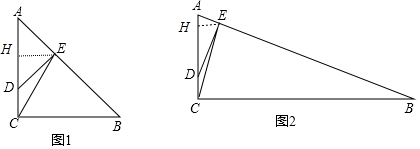 分析 (1)①作EH⊥AD于H,如图1,设CD=x,则AD=2x,AC=BC=3x,先证明△ADE为等腰直角三角形得到AH=HDF=HE=x,然后利用三角形面积公式计算出S△ADE和S△ACB,从而得到$\frac{{S}_{△ADE}}{{S}_{△ACB}}$的值;