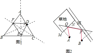 (2)如图2,A为马厩,B为帐篷,牧马人某一天要从马厩牵出马,先到草地边某一处牧马,再到河边饮水,然后回到帐篷,请你帮他制定这一天的最短路线.