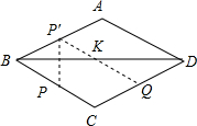 分析 先作点P关于BD的对称点P′,连接P′Q交BD于K,此时PK+QK有最小值.然后证明四边形BCQP′为平行四边形,即可求出PK+QK=P′Q=BC=2.