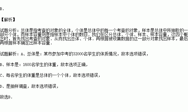 为了解某市参加中考的32000名学生的体质情况,抽查了其中1600名学生的体重进行统计分析.下面叙述正确的是