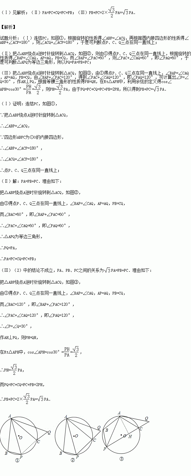 (Ⅰ)如图①,把△ABP绕点A逆时针旋转到△ACQ,求证:点P、C、Q三点在同一直线上.