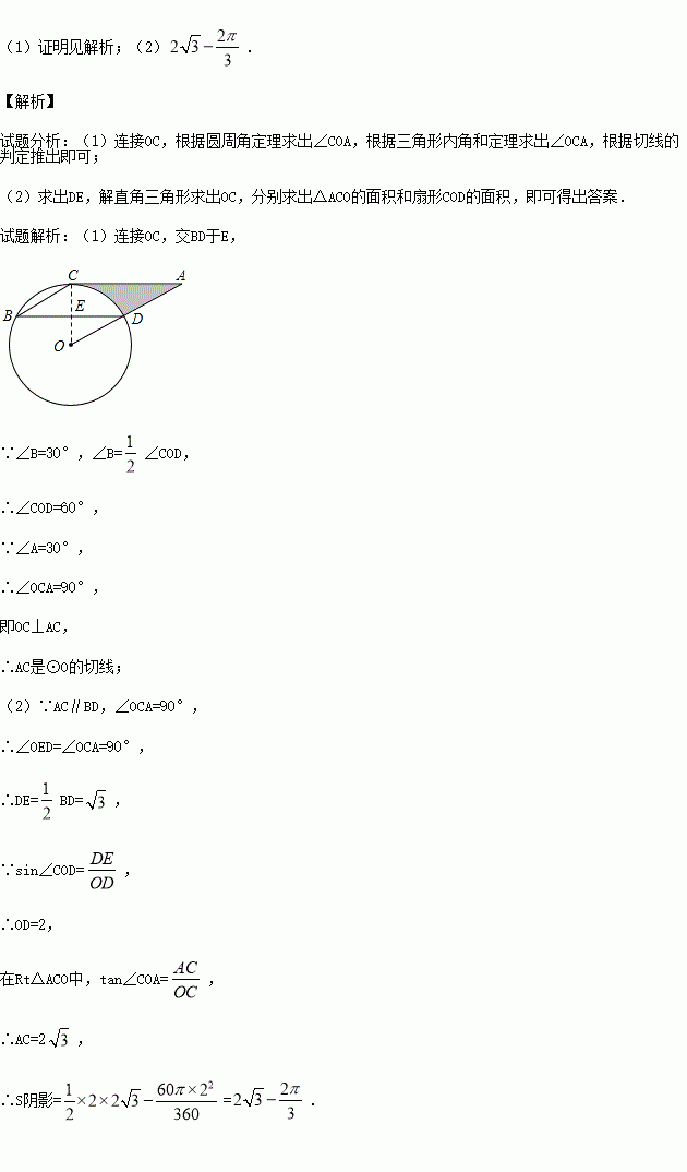 如图,点B、C、D都在⊙O上,过C点作CA∥BD交OD的延长线于点A,连接BC,∠B=∠A=30°,BD=