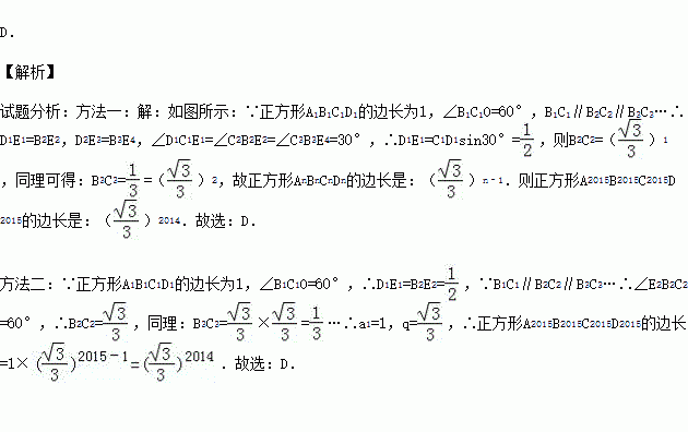 在平面直角坐标系中,正方形A1B1C1D1、D1E1E2B2、A2B2C2D2、D2E3E4B3、A3B3C3D3…按如图所示的方式放置,其中点B1在y轴上,点C1、E1、E2、C2、E3、E4、C3…在x轴上,已知正方形A1B1C1D1的边长为1,∠B1C1O=60°,B1C1∥B2C2∥B3C3…则正方形A2015B2015C2015D2015的边长是( )