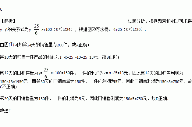 如图是本地区一种产品30天的销售图象,产品日销售量y(单位:件)与时间t(单位:天)的大致函数关系如图①,图②是一件产品的销售利润z(单位:元)与时间t(单位:天)的函数关系,已知日销售利润=日销售量×一件产品的销售利润,下列结论错误的是( )