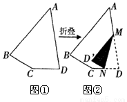 如图①,一张四边形纸片ABCD,∠A=50°,∠C=150°.若将其按照图②所示方式折叠后,恰好MD′∥AB,ND′∥BC,则∠D的度数为 .