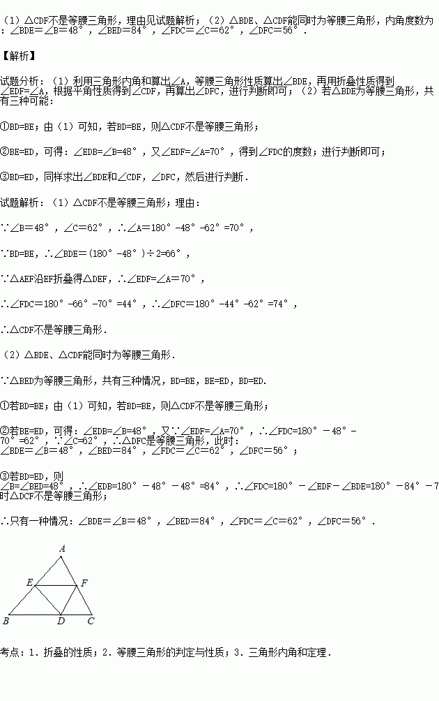 如图,已知△ABC中,∠B=48°,∠C=62°,点E、点F分别在边AB和边AC上,将把△AEF沿EF折叠得△DEF,点D正好落在边BC上(点D不与点B.点C重合).
