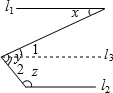 分析:过∠y的顶点作l3∥l1,然后根据两直线平行,内错角相等表示出∠1,两直线平行,同旁内角互补表示出∠2,再根据y=∠1+∠2代入整理即可得解.