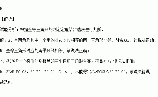D.在△ABC和△A′B′C′中,若AB=BC=CA,A′B′=B′C′=C′A′,则△ABC≌△A′B′C′