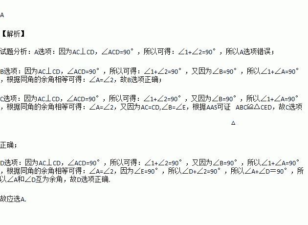 A.∠1=∠2 B.∠A=∠2 C.△ABC≌△CED D.∠A与∠D互为余角