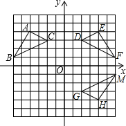 分析:根据网格结构找出点A、B、C关于y轴的对应点D、E、F的位置,然后顺次连接即可;再根据网格结构找出点D、E、F关于x轴的对应点G、H、M的位置,然后顺次连接即可;进而得出△ABC与△GHM存在的位置关系.