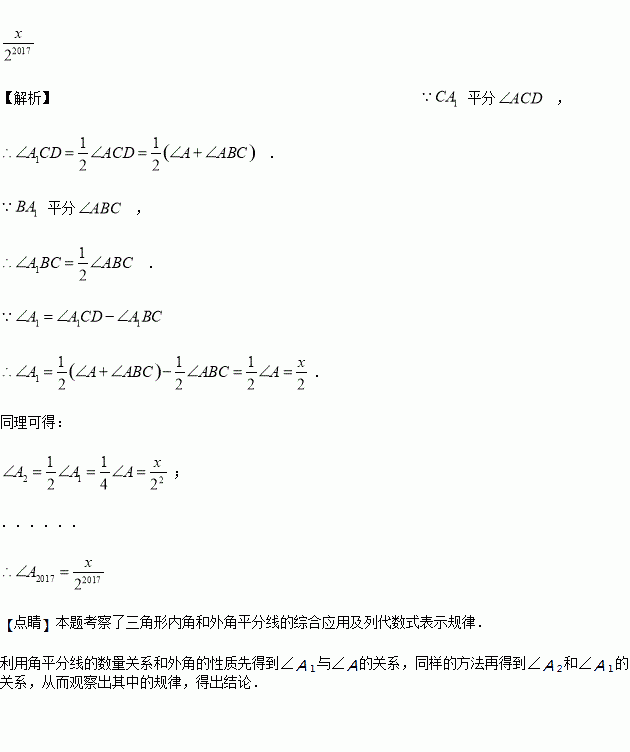如图,在△ABC中,∠ABC与∠ACD的平分线交于点A1, 得∠A1,∠A1BC与∠A1,CD的平分线交于点A2,得∠A2,……;∠A2016BC与∠A2016CD的平分线交于点A2017,则∠A2017=_______度.