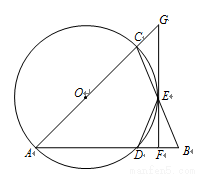 如图,△ABC中,AB=AC,以AC为直径的⊙O与边AB、BC分别交于点D、E.过E的直线与⊙O相切,与AC的延长线交于点G,与AB交于点F.