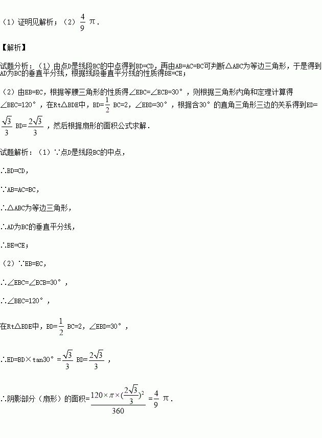 如图,点D是线段BC的中点,分别以点B,C为圆心, BC长为半径画弧,两弧相交于点A,连接AB,AC,AD,点E为AD上一点,连接BE,CE.