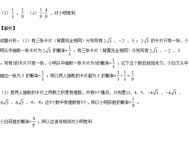 (2)小刚为他们俩设计了一个游戏规则:若两人抽取的卡片上两数之积是有理数,则小明获胜,否则小白获胜.你认为这个游戏规则对谁有利?请说明理由.