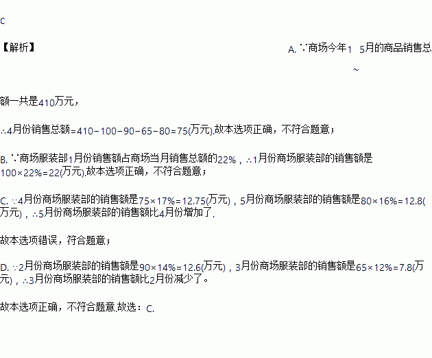 A. 4月份商场的商品销售总额是75万元 B. 1月份商场服装部的销售额是22万元