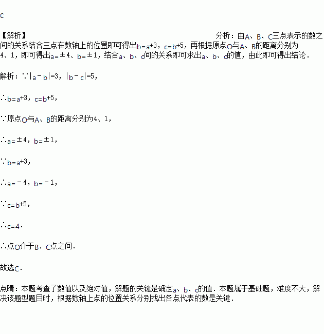 如图数轴的A、B、C三点所表示的数分别为a、b、c.若|a﹣b|=3,|b﹣c|=5,且原点O与A、B的距离分别为4、1,则关于O的位置,下列叙述何者正确?( )