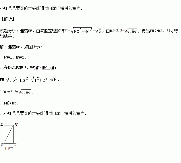 (2015秋•怀柔区期末)小红家最近新盖了房子,室内装修时,木工师傅让小红爸爸去建材市场买一块长3m,宽2.2m的薄木板用来做家居面,到了市场爸爸看到满足这个尺寸的木板有点大,买还是不买爸爸犹豫了,因为他知道他家门框高只有2m,宽只有1m,他不知道这块木板买回家后能不能完整的通过自家门框.请你替小红爸爸解决一下难题,帮他算一算要买的木板能否通过自家门框进入室内.(备用图可供做题参考,薄木板厚度可以忽略不计)