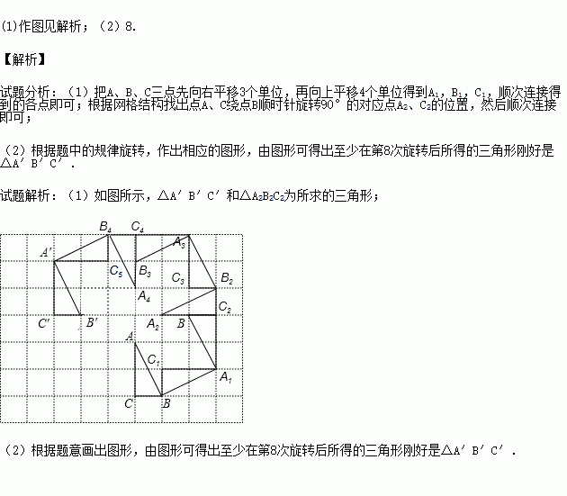 Èçͼ£¬ÔÚ9¡Á7µÄСÕý·½ÐÎÍø¸ñÖУ¬¡÷ABCµÄ¶¥µãA£¬B£¬CÔÚÍø¸ñµÄ¸ñµãÉÏ.½«¡÷ABCÏò×óÆ½ÒÆ3¸öµ¥Î»¡¢ÔÙÏòÉÏÆ½ÒÆ3¸öµ¥Î»µÃµ½¡÷A¡äB¡äC¡ä.ÔÙ½«¡÷ABC°´Ò»¶¨¹æÂÉÒÀ´ÎÐýת£ºµÚ1´Î£¬½«¡÷ABCÈÆµãB˳ʱÕëÐýת
