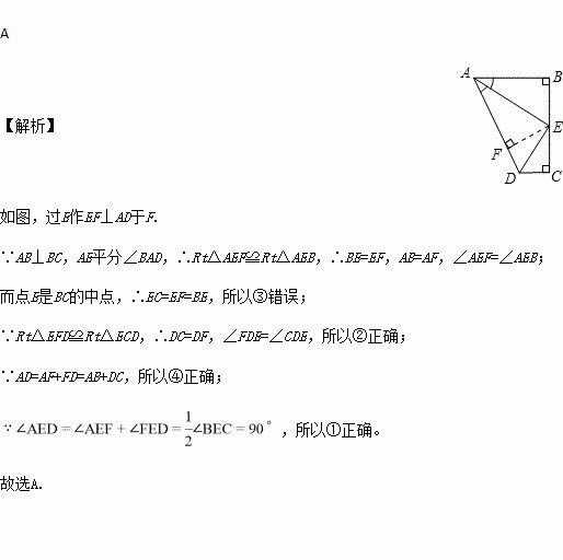 如图,点E是BC的中点,AB⊥BC, DC⊥BC,AE平分∠BAD,下列结论: ① ∠A E D =90°;