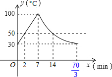·ÖÎö £¨1£©ÏÈÓÉ¿ª»ú¼ÓÈÈʱˮÎÂÿ·ÖÖÓÉÏÉý10¡æ£¬¿ÉµÃ´Ó30¡æµ½100¡æÐèÒª7·ÖÖÓ£¬ÉèÒ»´Îº¯Êý¹ØÏµÊ½Îª£ºy=k1x+b£¬½«£¨0£¬30£©£¬£¨7£¬100£©´úÈ룬ÀûÓôý¶¨ÏµÊý·¨Çó³öÒ»´Îº¯ÊýµÄ½âÎöʽ£»Éè·´±ÈÀýº¯Êý¹ØÏµÊ½Îª£ºy=$\frac{{k}_{2}}{x}$£¬½«£¨7£¬100£©´úÈ룬ÀûÓôý¶¨ÏµÊý·¨Çó³ö·´±ÈÀýº¯ÊýµÄ½âÎöʽ£»