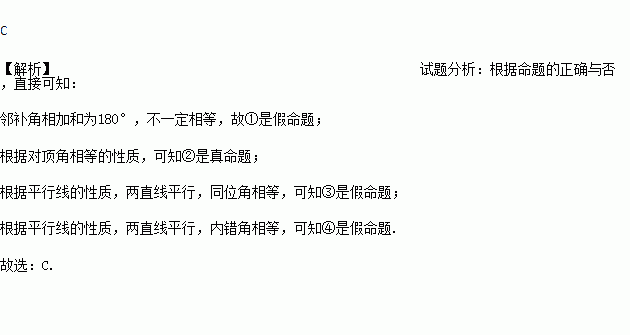 ②相等的角是对顶角;