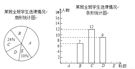 (7分)我市某校在推进新课改的过程中,开设的体育选修课有:A:篮球,B:足球,C:排球,D:羽毛球,E:乒乓球,学生可根据自己的爱好选修一门,学校李老师对某班全班学生的选课情况进行调查统计,制成了两幅不完整的统计图(如图).