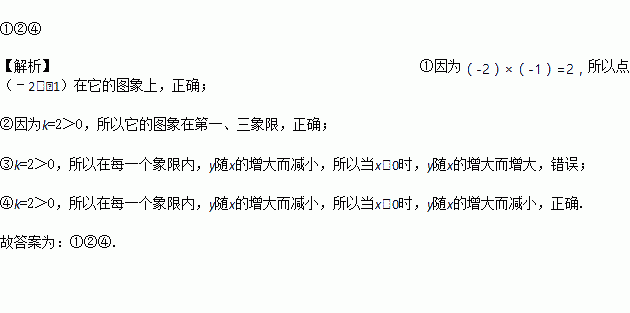 ,下列说法:①点(﹣2,﹣1)在它的图象上;②它的图象在第一、三象限;③当x>0时,y随x的增大而增大;④当x<0时,y随x的增大而减小.上述说法中,正确的序号是_____(填上所有你认为正确的序号)